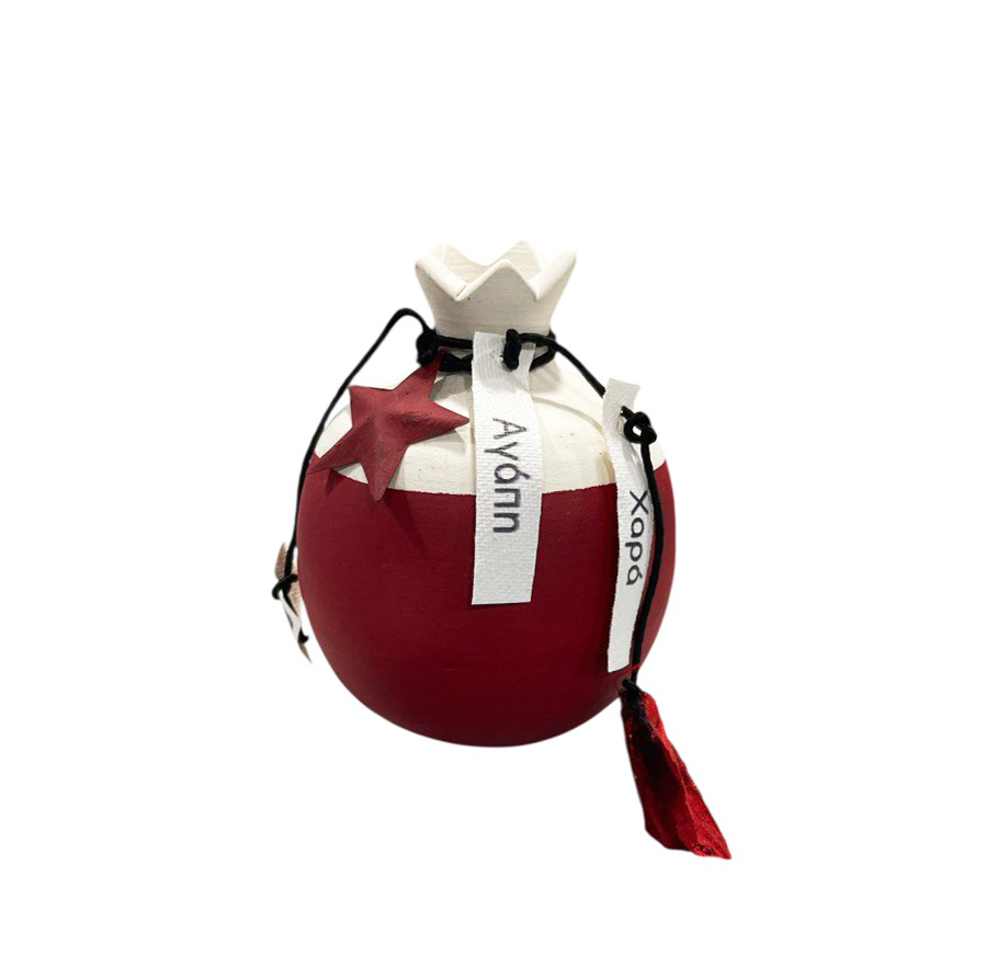 - Κεραμικό κόκκινο ματ ρόδι ζωγραφισμένο στο χέρι, εορταστικό με γούρι του 26′ από την Νικηφορίδου. Κεραμικό ρόδι με σχέδια, ζωγραφισμένο εξωτερικά στο χέρι. Διαστάσεις: 6 x 9 εκ. *Ενδέχεται να υπάρχουν διαφοροποιήσεις χρωματικά στις κορδέλες και στα γούρια λόγο του ότι είναι χειροποίητα.