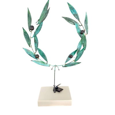 - Χειροποίητο διακοσμητικό στεφάνι ελιάς, μεταλλικό, από φύλλα αλπακά, με πατίνα πράσινου οξειδωμένου χαλκού, σε λευκή βάση. Διαστάσεις: 19,5 x 7 x 29 εκ.