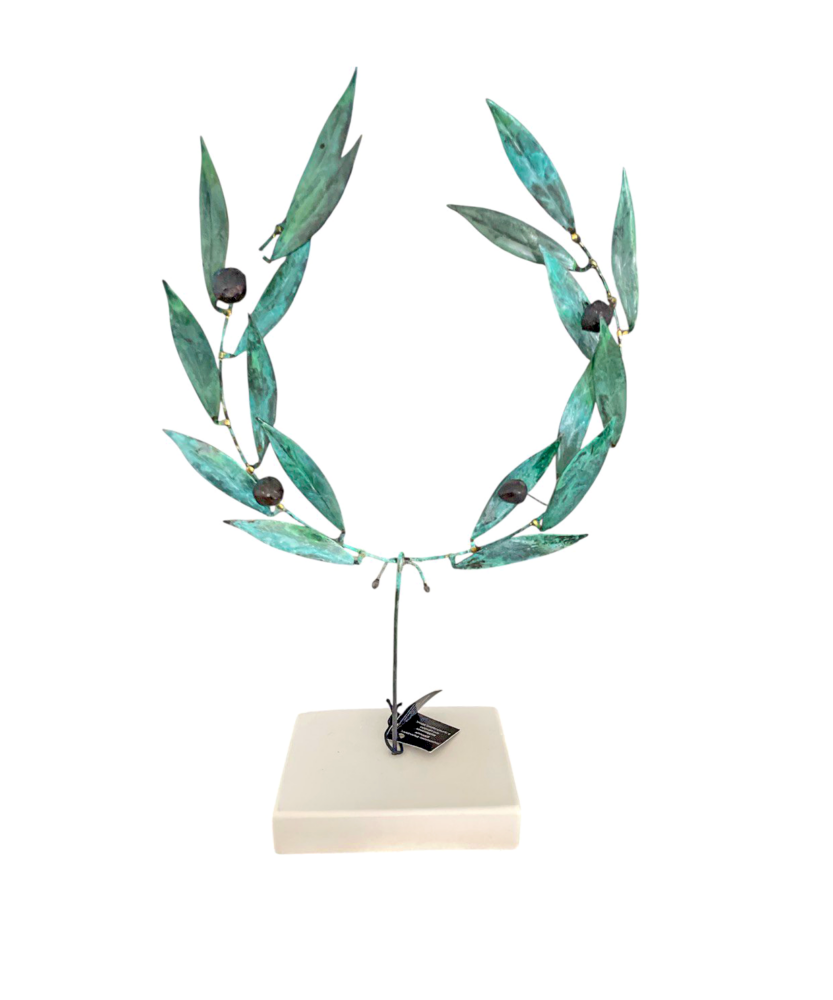 - Χειροποίητο κεραμικό γλυπτό Στεφάνι ελιάς. Η ελιά θεωρείται σύμβολο της ειρήνης και σοφίας, αθανασίας και ευφορίας, γαλήνης, προστασίας και γονιμότητας. Δέντρο του καλού συνδεδεμένο με την αναγέννηση και το φως.
