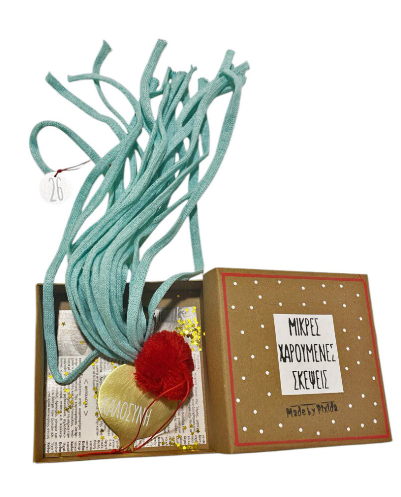 - Χάρτινο κουτί με ξύλινο πρόσωπο και ευχή...''Όνειρα'' από την Παναγιώτα από το κέντρο "ΠΥΞΙΔΑ". Χάρτινο κουτί με γούρι του 26' και δώρο αλουμινίου με ευχή , ζωγραφισμένο εξωτερικά στο χέρι. Διαστάσεις κουτιού: 12 Χ 12 εκ. *Ενδέχεται να υπάρχουν διαφοροποιήσεις χρωματικά στα αντικέιμενα λόγο του ότι είναι χειροποίητα