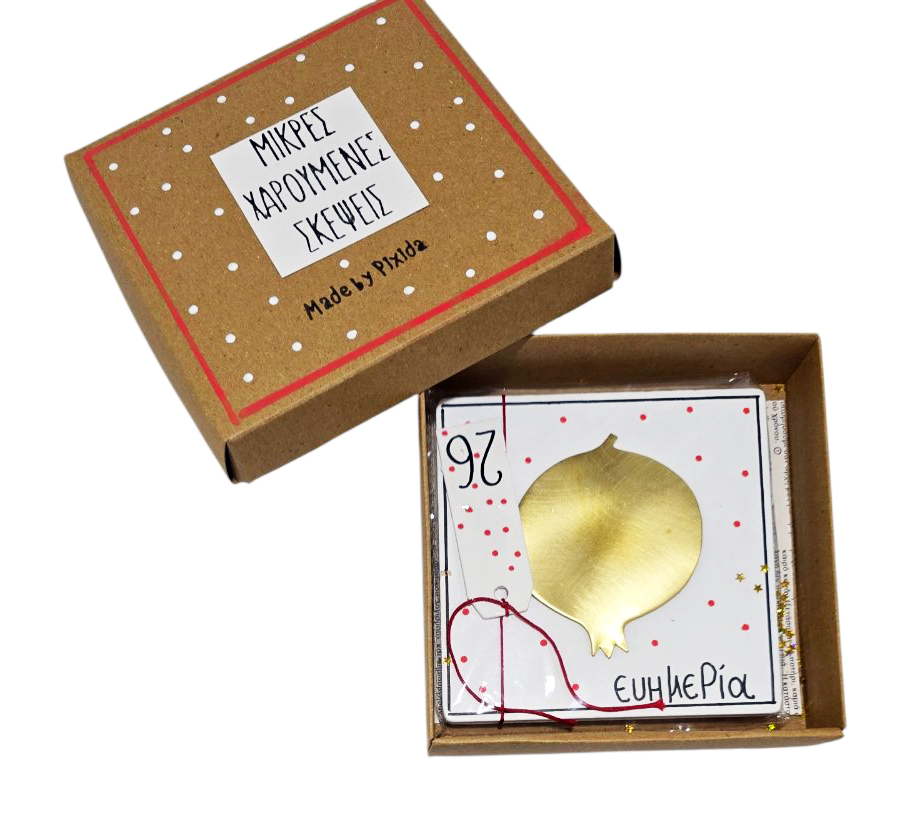 - Χάρτινο κουτί με ρόδι και ευχή...''Ευημερία'' από τον Χριστόφορο από το κέντρο "ΠΥΞΙΔΑ". Χάρτινο κουτί με γούρι του 26' και δώρο αλουμινίου με ευχή , ζωγραφισμένο εξωτερικά στο χέρι. Διαστάσεις κουτιού: 12 Χ 12 εκ. *Ενδέχεται να υπάρχουν διαφοροποιήσεις χρωματικά στα αντικέιμενα λόγο του ότι είναι χειροποίητα