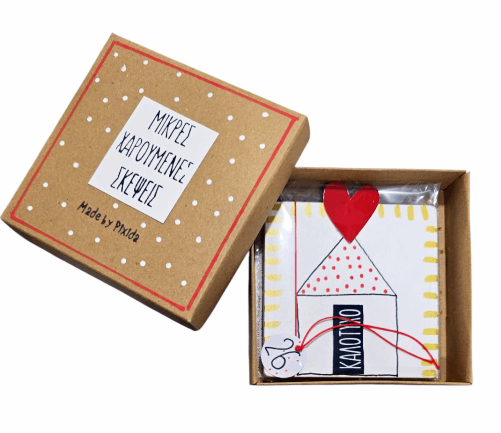 - Χάρτινο κουτί με σπιτάκια και ευχή...''Καλώς ήρθατε στο σπίτι μας'' από τον Γιάγκος από το κέντρο "ΠΥΞΙΔΑ". Χάρτινο κουτί με γούρι του 26' και σπίτια με ευχή , ζωγραφισμένο εξωτερικά στο χέρι. Διαστάσεις κουτιού: 12 Χ 12 εκ. *Ενδέχεται να υπάρχουν διαφοροποιήσεις χρωματικά στα αντικέιμενα λόγο του ότι είναι χειροποίητα