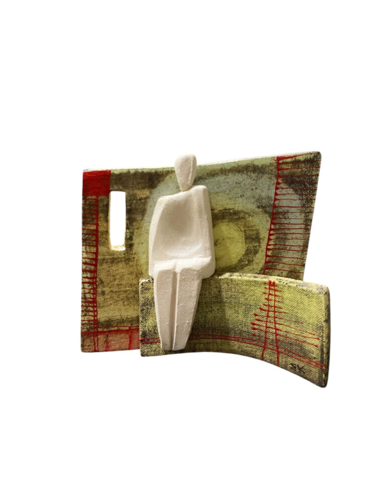 - Κεραμικό χειροποίητο επιτραπέζιο διακοσμητικό που απεικονίζει μια αφηρημένη ανθρώπινη φιγούρα να κάθεται με φόντο ένα τοίχωμα με ζωγραφιστά γεωμετρικά σχέδια πάνω σε αυτό. Μια ξεχωριστή δημιουργία βασισμένη σε πρωτότυπα σχέδια. Διαστάσεις: 15,5 x 2 x 14,5 εκ.