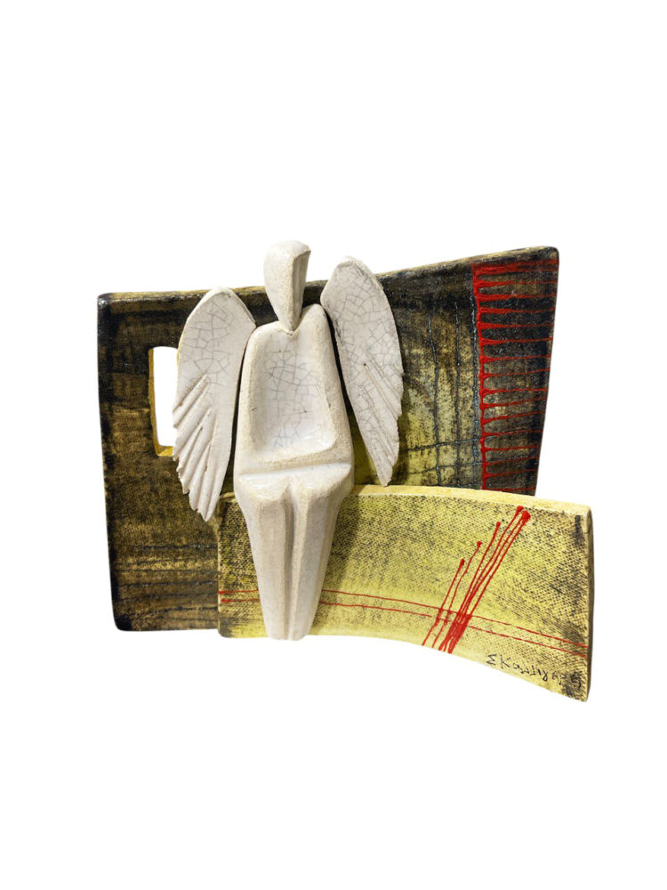 - Κεραμικό χειροποίητο επιτραπέζιο διακοσμητικό που απεικονίζει μια αφηρημένη αγγελική φιγούρα να κάθεται με φόντο ένα τοίχωμα με ζωγραφιστά γεωμετρικά σχέδια πάνω σε αυτό. Μια ξεχωριστή δημιουργία βασισμένη σε πρωτότυπα σχέδια. Διαστάσεις: 15,5 x 2 x 14,5 εκ.