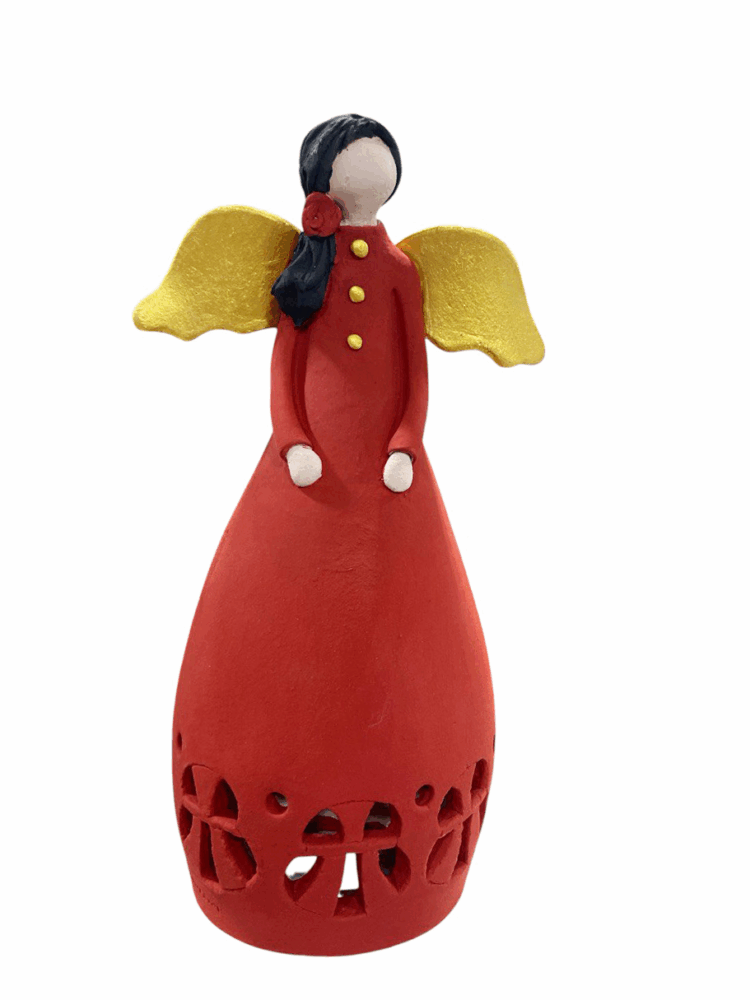 - Χειροποίητο κεραμικό γλυπτό φαναράκι με θέμα Νεράιδα, σε κόκκινο χρώμα με χρυσά φτερά.