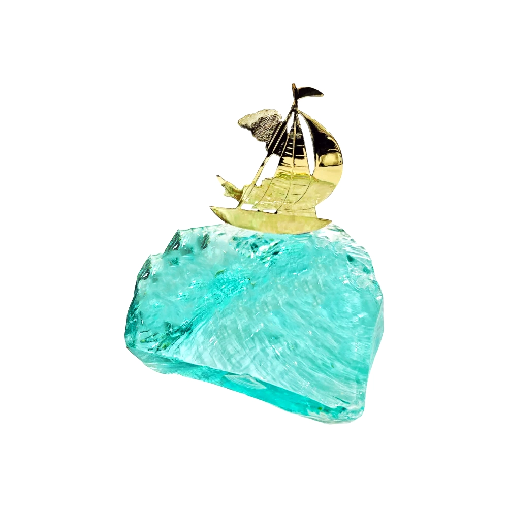 - Μοναδικό χειροποίητο διακοσμητικό γλυπτό από ορείχαλκο, το οποίο έχει επεξεργαστεί με τη μέθοδο του κεριού, μια αρχαία τεχνική για την κατασκευή κοσμημάτων και γλυπτών, με σχέδιο Ιστιοπλοϊκό πάνω σε βάση ακατέργαστου γυαλιού. Διαστάσεις: 12 x 11,5 x 13 εκ.