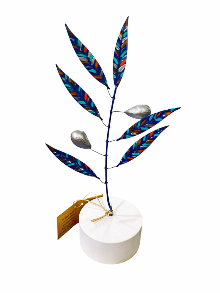 - Χειροποίητο μεταλλικό δέντρο ελιάς πολύχρωμο της Σοφίας Μπακιρτζή με πλεγμένο μεταλλικό κορμό σε σπιράλ και κεραμικούς καρπούς ελιάς, σε βάση από επεξεργασία ριτίνης. Διαστάσεις ελιάς: 12 x 20 εκ. Διαστάσεις βάσης: 6 x 6 εκ. H ελιά είναι σύμβολο ειρήνης και σοφίας, αθανασίας και ευφορίας, γαλήνης, προστασίας και γονιμότητας. Δέντρο του καλού συνδεδεμένο με την αναγέννηση και το φως. Ένα εντυπωσιακό, συμβολικό δώρο με εξαιρετικές λεπτομέρειες και μοντέρνα αισθητική.