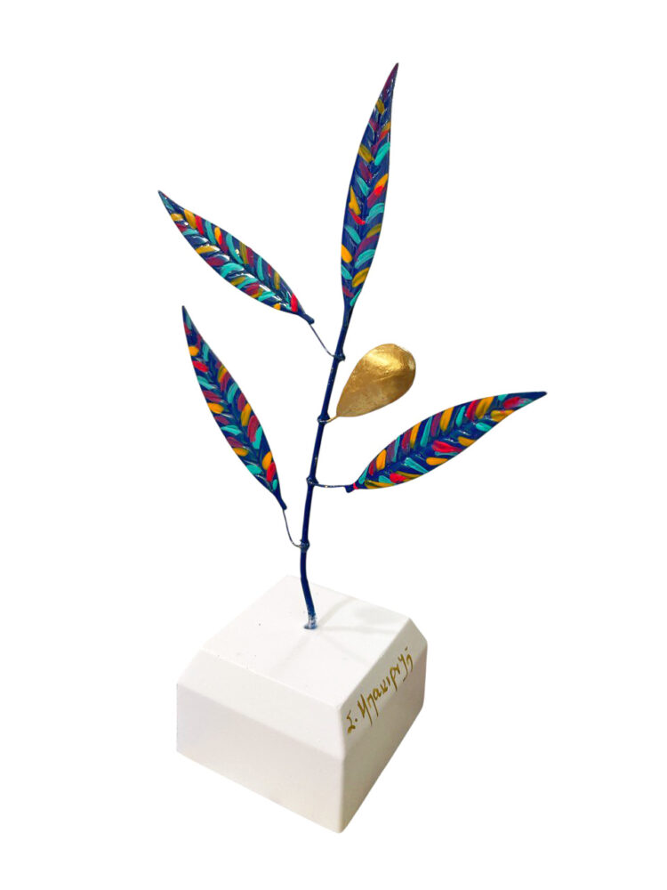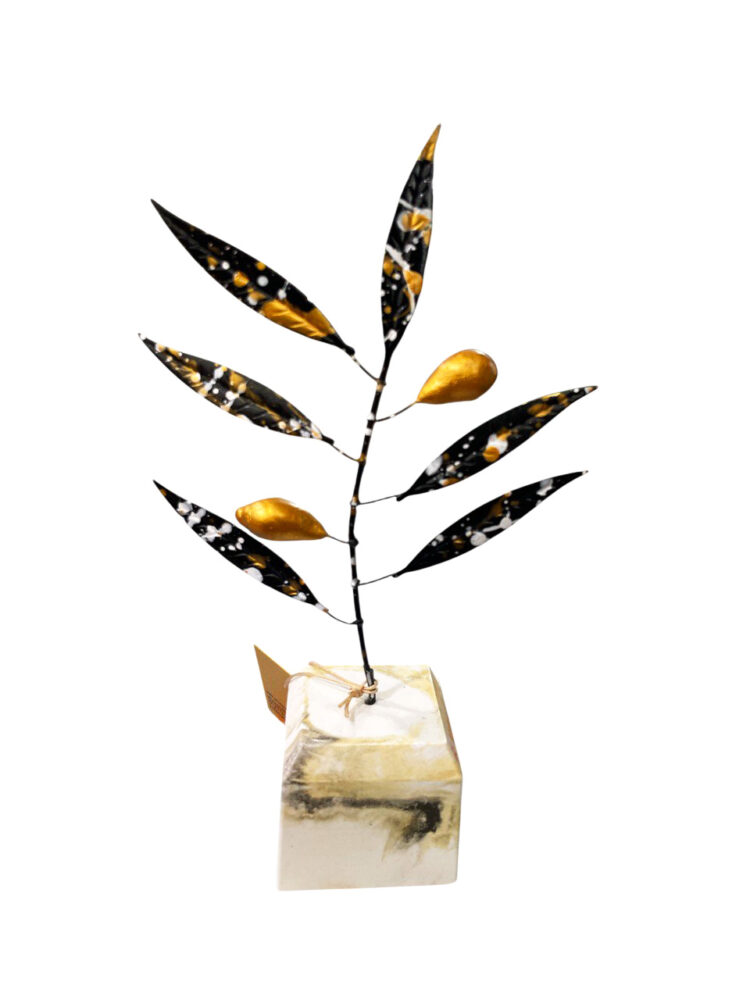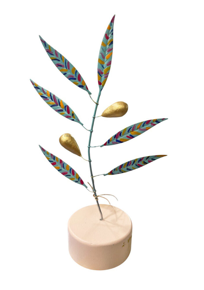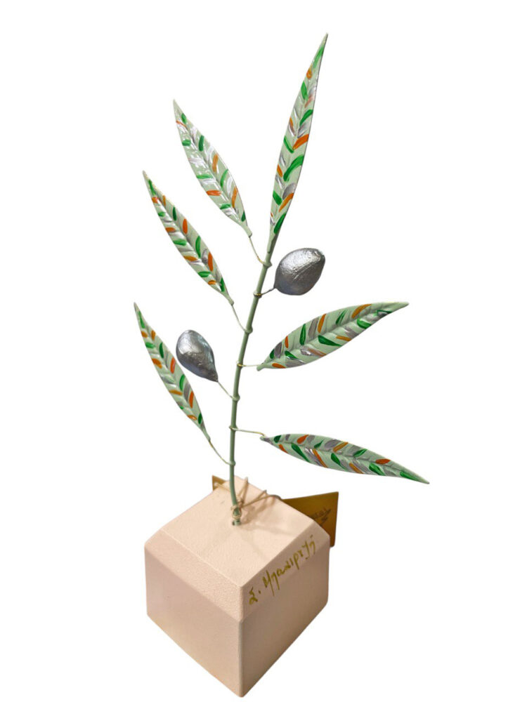 - Χειροποίητο μεταλλικό δέντρο ελιάς πολύχρωμο της Σοφίας Μπακιρτζή με πλεγμένο μεταλλικό κορμό σε σπιράλ και κεραμικούς καρπούς ελιάς, σε βάση από επεξεργασία ριτίνης. Διαστάσεις ελιάς: 12 x 17 εκ. Διαστάσεις βάσης: 5 x 5 εκ. H ελιά είναι σύμβολο ειρήνης και σοφίας, αθανασίας και ευφορίας, γαλήνης, προστασίας και γονιμότητας. Δέντρο του καλού συνδεδεμένο με την αναγέννηση και το φως. Ένα εντυπωσιακό, συμβολικό δώρο με εξαιρετικές λεπτομέρειες και μοντέρνα αισθητική.