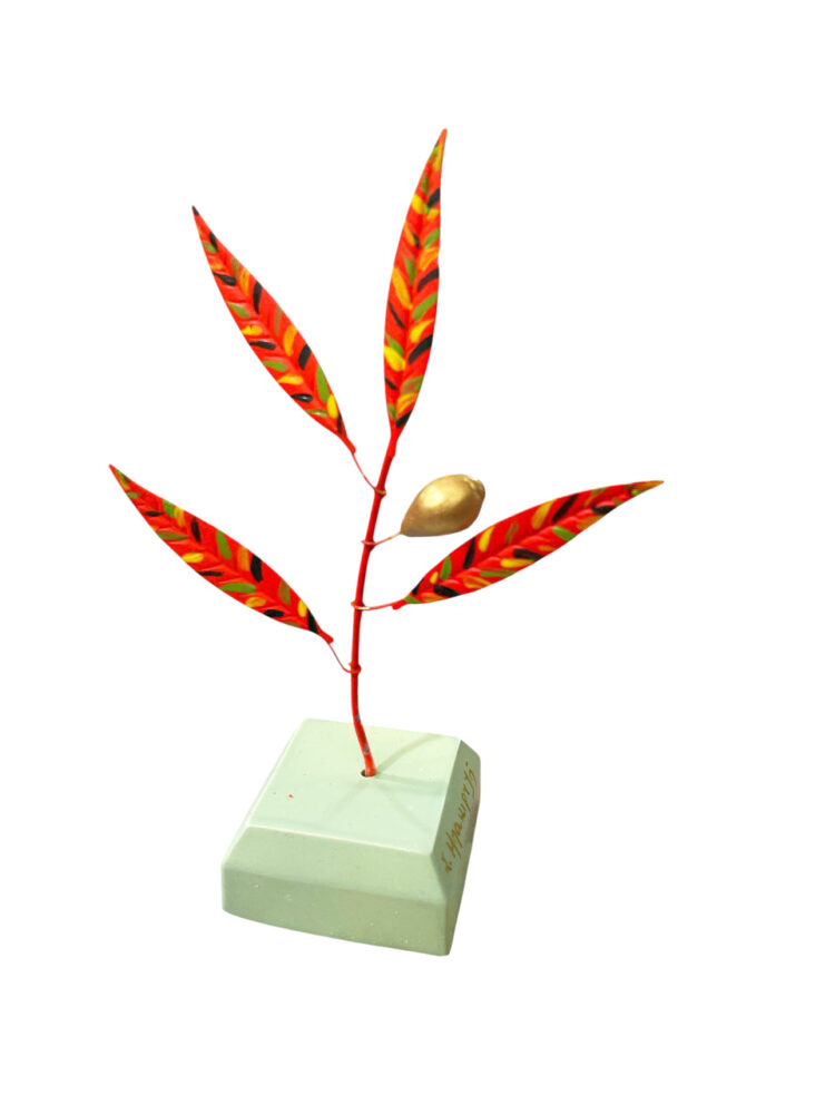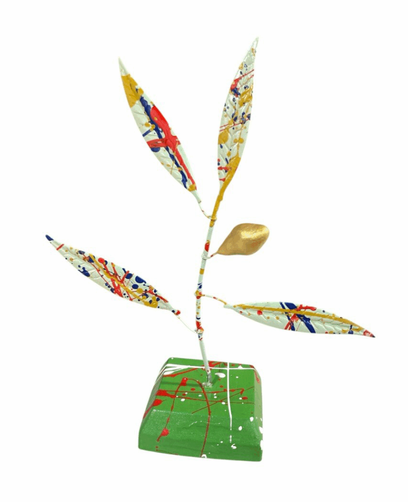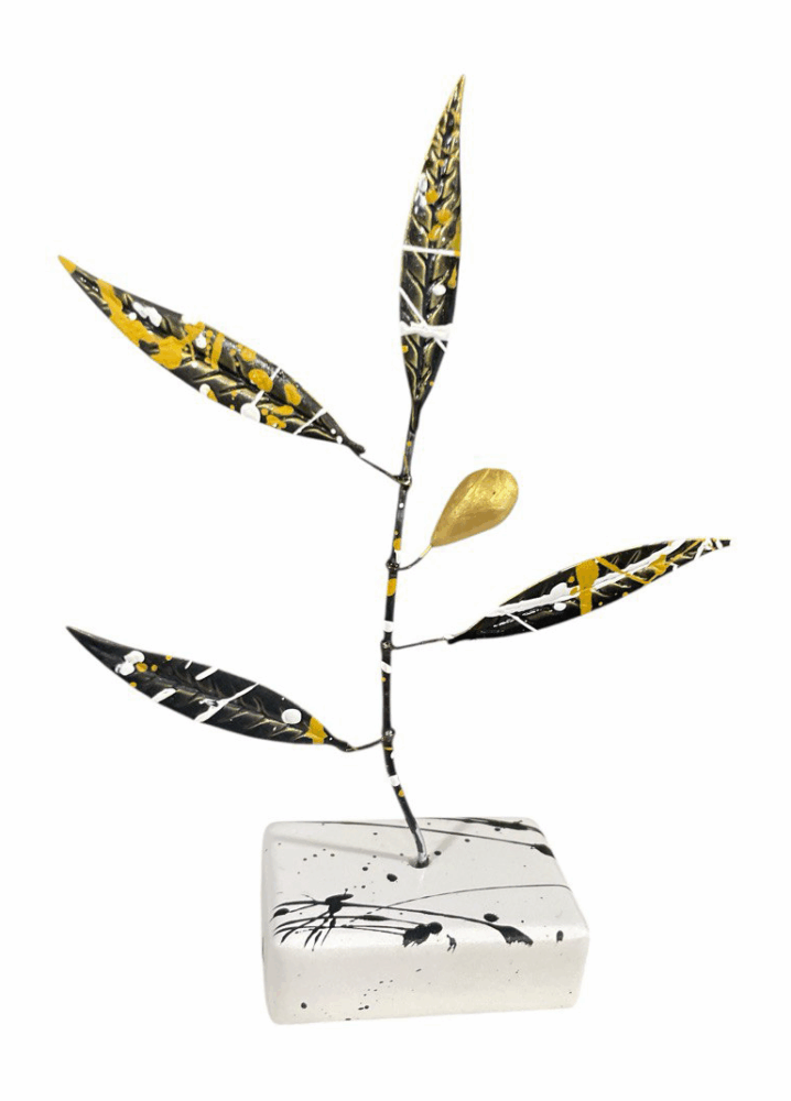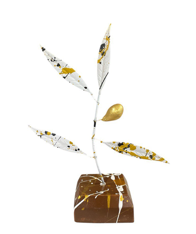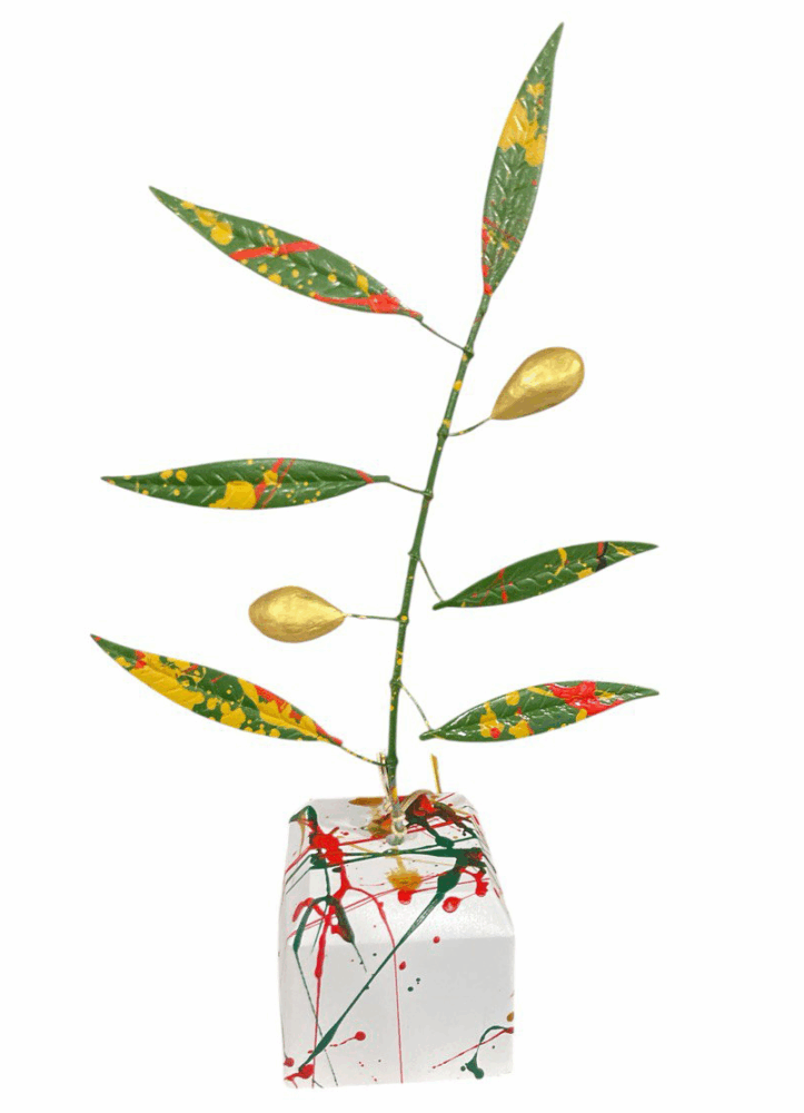 - Χειροποίητο μεταλλικό δέντρο ελιάς πολύχρωμο της Σοφίας Μπακιρτζή με πλεγμένο μεταλλικό κορμό σε σπιράλ και κεραμικούς καρπούς ελιάς, σε βάση από επεξεργασία ριτίνης. Διαστάσεις ελιάς: 12 x 20 εκ. Διαστάσεις βάσης: 5 x 5 εκ. H ελιά είναι σύμβολο ειρήνης και σοφίας, αθανασίας και ευφορίας, γαλήνης, προστασίας και γονιμότητας. Δέντρο του καλού συνδεδεμένο με την αναγέννηση και το φως. Ένα εντυπωσιακό, συμβολικό δώρο με εξαιρετικές λεπτομέρειες και μοντέρνα αισθητική.