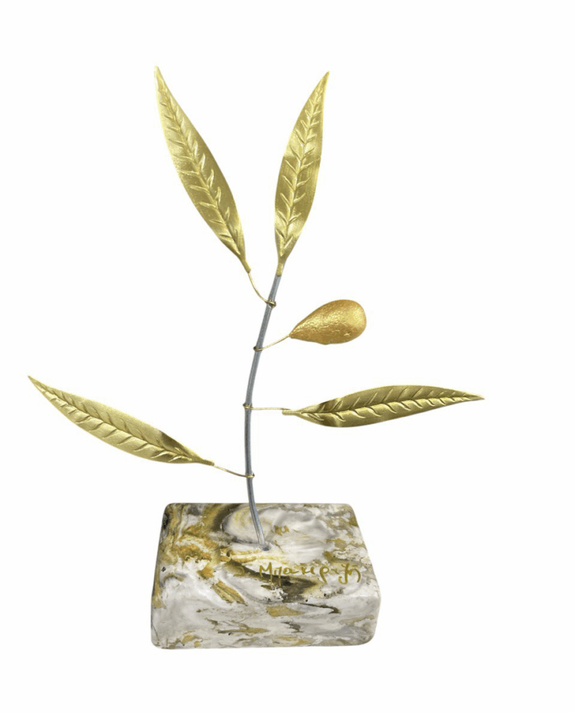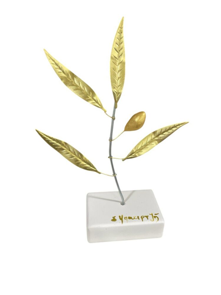 - Χειροποίητο, επιχρυσωμένο στεφάνι ελιάς με χρυσό 24k, κατασκευασμένο από φυσικό φυτό ελιάς, σε βάση από μάρμαρο σε λευκό χρώμα. H ελιά είναι σύμβολο ειρήνης και σοφίας, αθανασίας και ευφορίας, γαλήνης, προστασίας και γονιμότητας. Δέντρο του καλού συνδεδεμένο με την αναγέννηση και το φως. Ένα πρωτότυπο χειροποίητο διακοσμητικό, που εντυπωσιάζει με την λάμψη και το σχήμα του και που συνδυάζει το κλασικό σχέδιο με την σύγχρονη δημιουργία, ιδανικό δώρο για κάθε περίσταση. Αποτελεί μια εξαιρετική πρόταση προσωπικού, επαγγελματικού αλλά και διακοσμητικού…