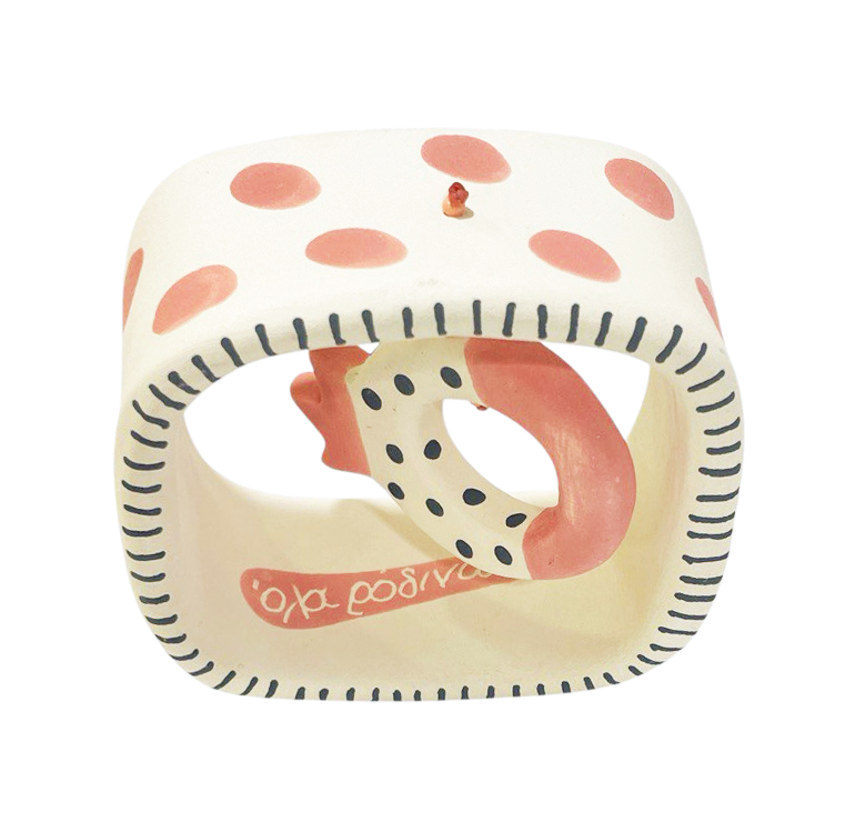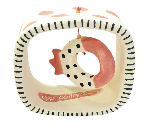 - Χειροποίητo κεραμικό γούρι σε stand με ευχή : ΄΄ όλα ρόδινα΄΄ κατασκευασμένο και ζωγραφισμένο εξωτερικά στο χέρι. Διαστάσεις: 8,5 x 5 x 8,5 εκ.