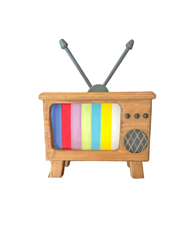 Χειροποίητα κεραμικά σουβέρ σε ξύλινη βάση με σχέδιο vintage τηλεόραση. Κατασκευασμένοι από λευκό πηλό με μπαντανάδες και βάση από μασίφ ξύλο πεύκου.