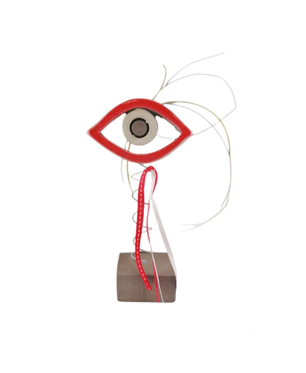 Handmade ceramic decorative eye, worked with imagination and taste, in red and black, with decorative ribbon and charm 2022.