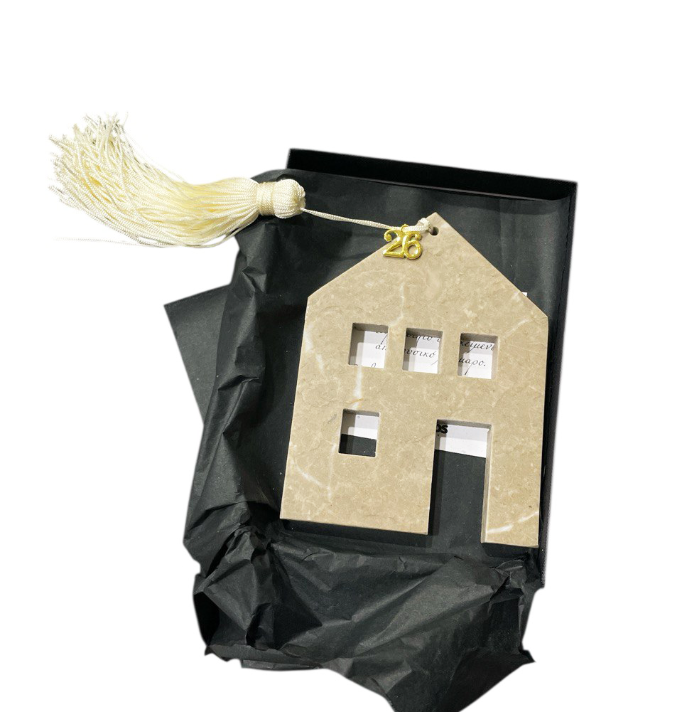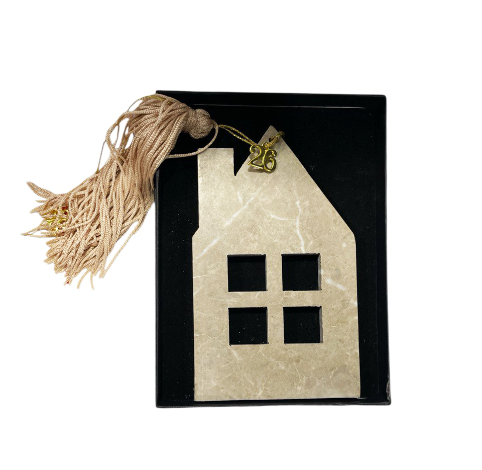 - Χειροποίητο μαρμάρινο διακοσμητικό μπέζ, σε σχήμα σπιτιού με γούρι του 26΄. Ένα ξεχωριστό διακοσμητικό, αποτελεί μια μοντέρνα πρόταση για προσωπικό-εορταστικό δώρο και επαγγελματικό! Διαστάσεις αντικειμένου : 10 x 1 x 13 εκ. Διαστάσεις κουτιού: 12 x 3 x 16 εκ.