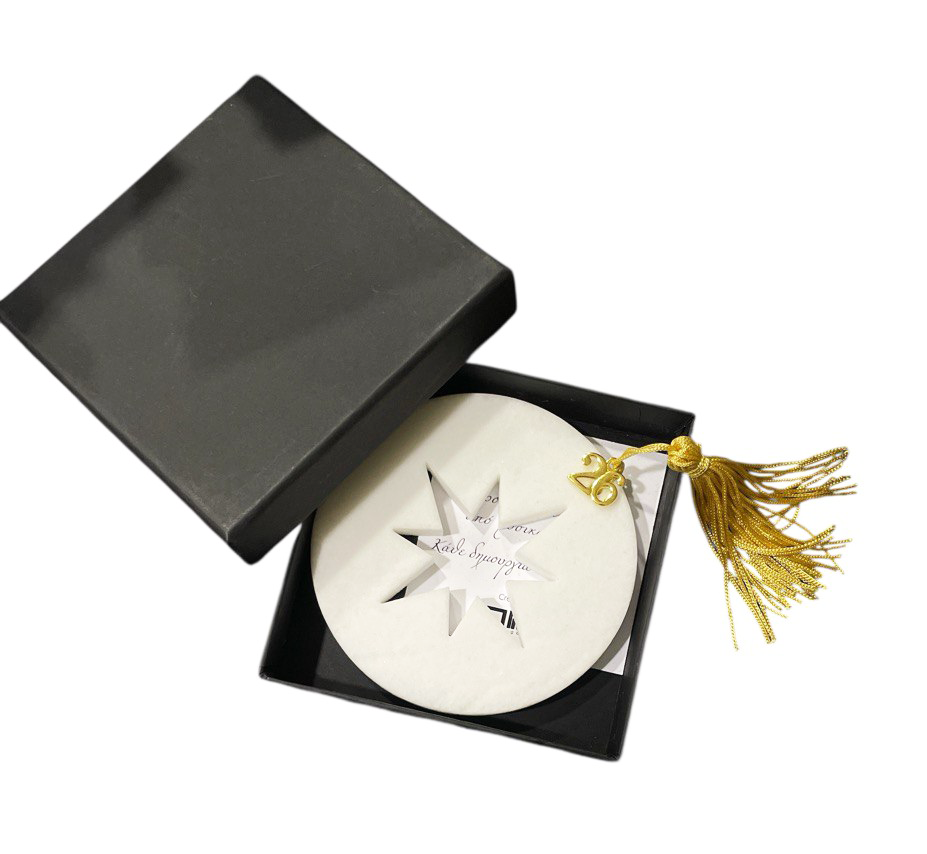 - Χειροποίητο μαρμάρινο διακοσμητικό λευκό, σε σχήμα αστεριού με γούρι του 26΄. Ένα ξεχωριστό διακοσμητικό, αποτελεί μια μοντέρνα πρόταση για προσωπικό-εορταστικό δώρο και επαγγελματικό! Διάμετρος αντικειμένου : 10 εκ. Διαστάσεις κουτιού: 11 x 3 x 11 εκ.