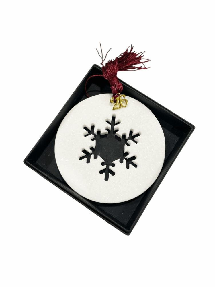 - Χειροποίητο μαρμάρινο διακοσμητικό λευκό, σε σχήμα χιονιού με γούρι του 26΄. Ένα ξεχωριστό διακοσμητικό, αποτελεί μια μοντέρνα πρόταση για προσωπικό-εορταστικό δώρο και επαγγελματικό! Διάμετρος αντικειμένου : 10 εκ. Διαστάσεις κουτιού: 11 x 3 x 11 εκ.